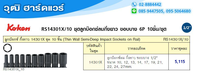 ลูกบ๊อกซ์ลมกึ่งยาว-บาง ลูกบ๊อกซ์ลมกึ่งยาว-บาง ลูกบ๊อกซ์ Koken ลูกบล็อกลมกึ่งยาว-บาง Thin Walled Semi Deep Impact Socket on Rail |
