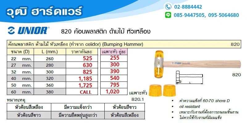 UNIOR 820 ค้อนพลาสติก ด้ามไม้ หัวเหลือง 22 - 60mm