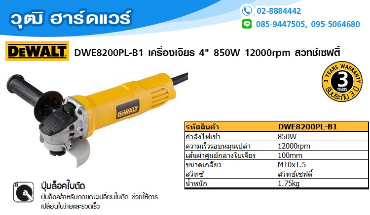 DEWALT DWE8200PL-B1 เครื่องเจียร 4" 850W 12000rpm สวิทช์เซฟตี้