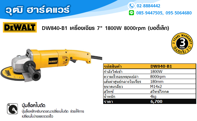 DEWALT DW840-B1 เครื่องเจียร 7" 1800W 8000rpm (บอดี้เล็ก)