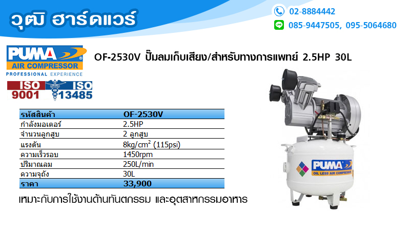 PUMA OF2530V ปั๊มลมเก็บเสียง/สำหรับทางการแพทย์ 2.5HP 30L |