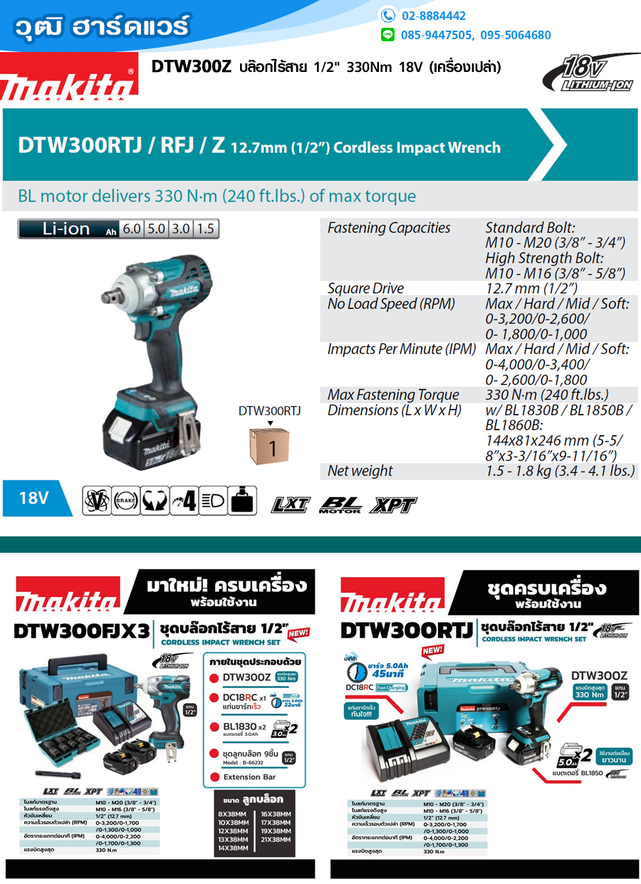 DTW-300 เป็นเครื่องบล็อค แบบไร้สาย จากมากีต้า แรงดันไฟฟ้า 18V