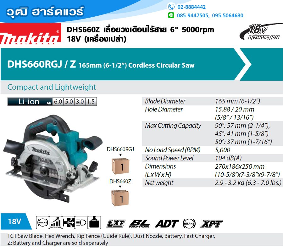 เลื่อยวงเดือนไร้สาย ขนาด 6 นิ้ว (165 มม.) 18V MAKITA รุ่น DHS-660Z