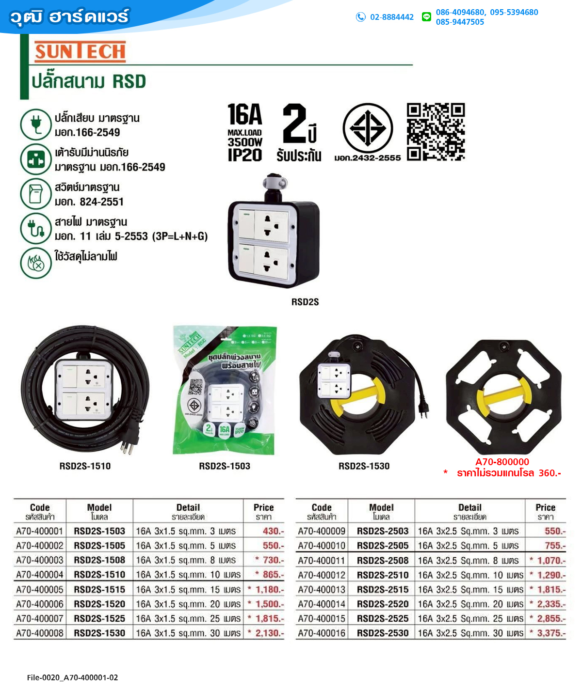 SUNTECH RSD2S-1520 ปลั๊กสนาม 16A 3x1.5sq.mmx20m |