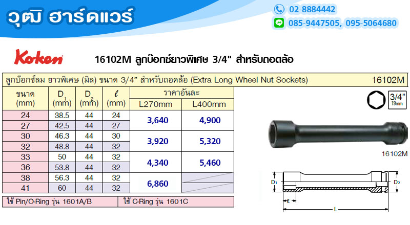 16102M-270-24 KOKEN 16102M-270 ลูกบ๊อกซ์ยาวพิเศษ 3/4" สำหรับถอดล้อ No.24