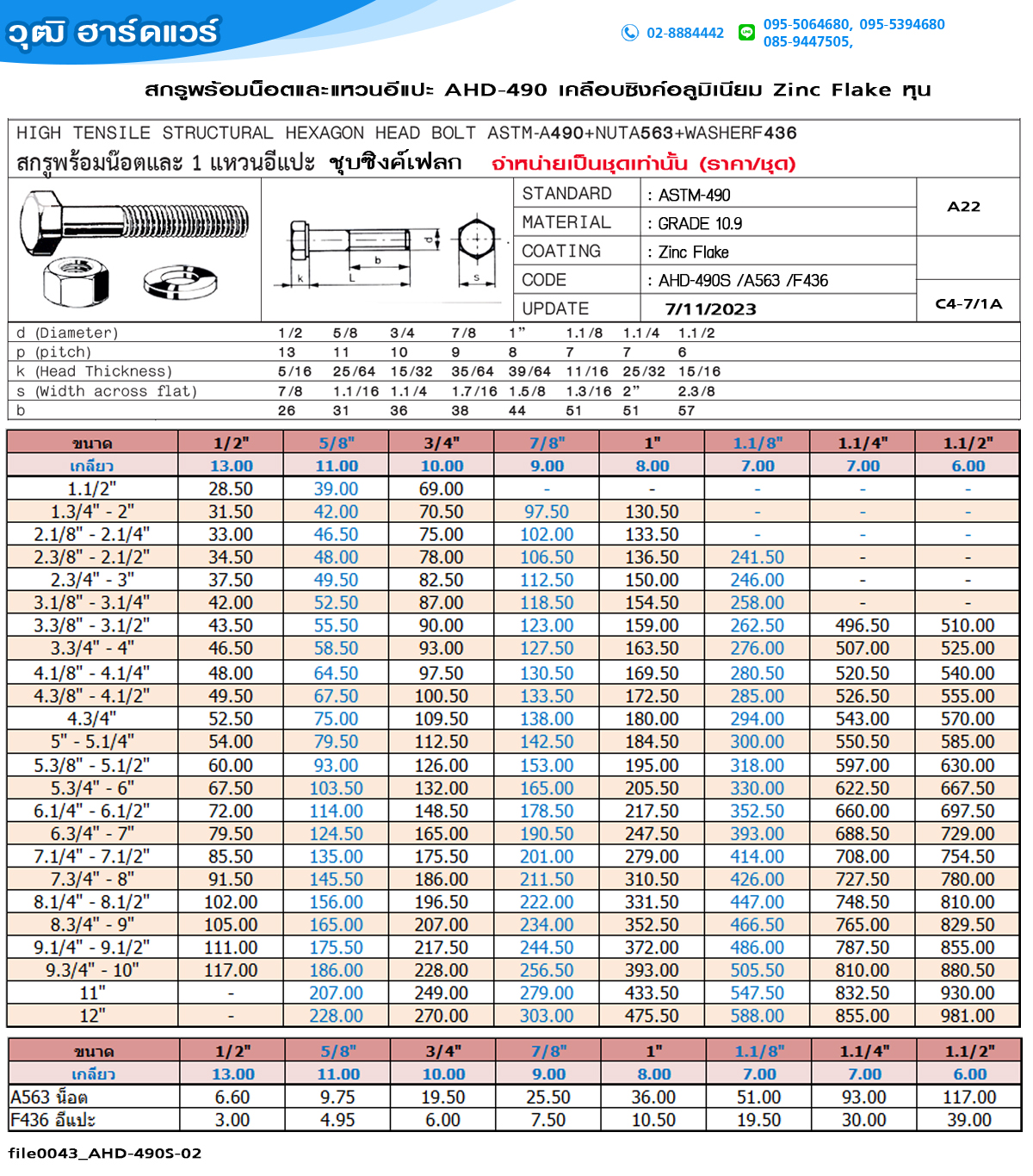 สกรูพร้อมหัวน็อตและแหวนอีแปะดำ A490 5/8"x2.1/8" |