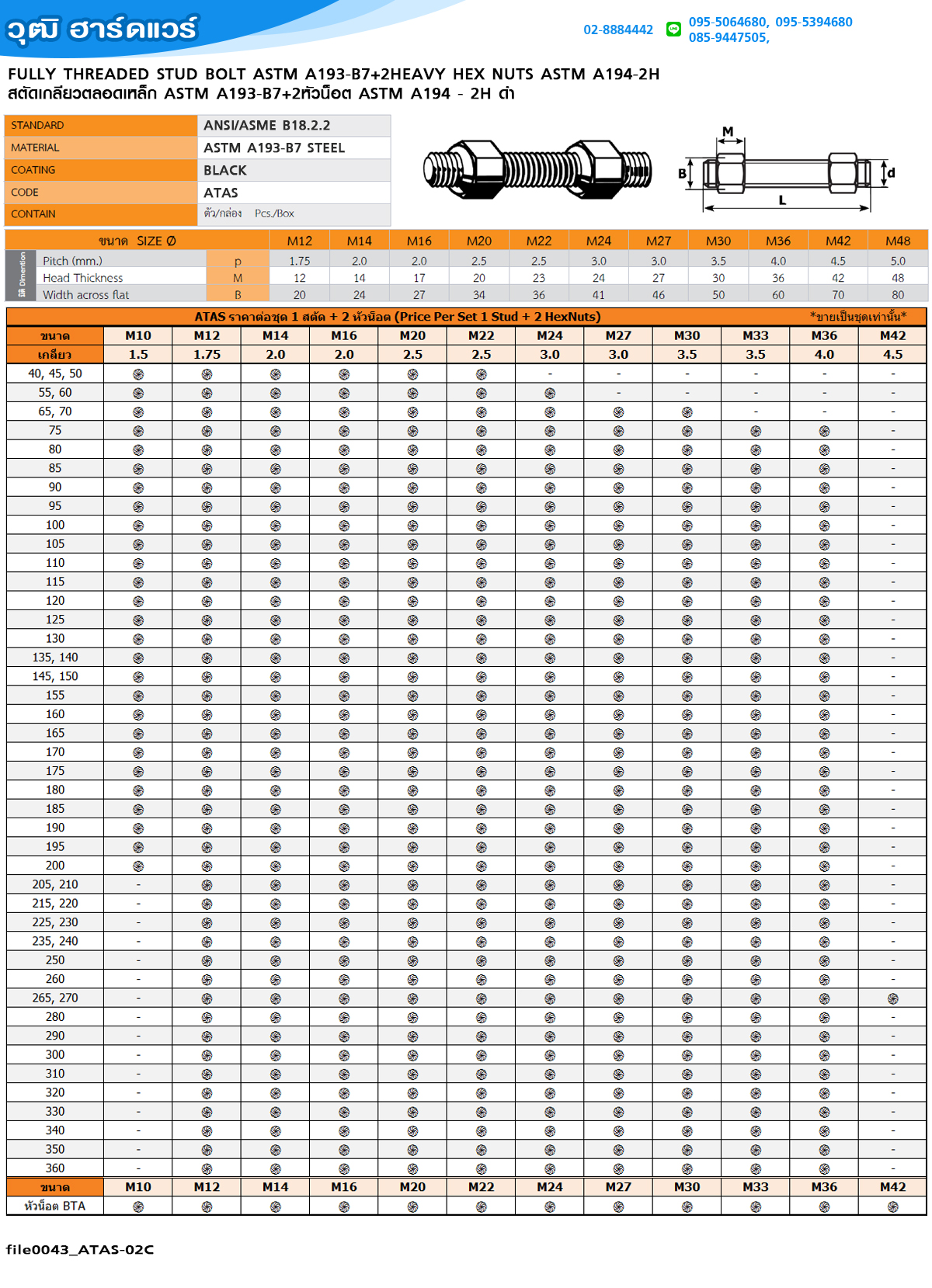 สตัดเกลียวตลอดเหล็ก ASTM A193-B7+2หัวน็อต 1/2"x13 ยาว 210mm |
