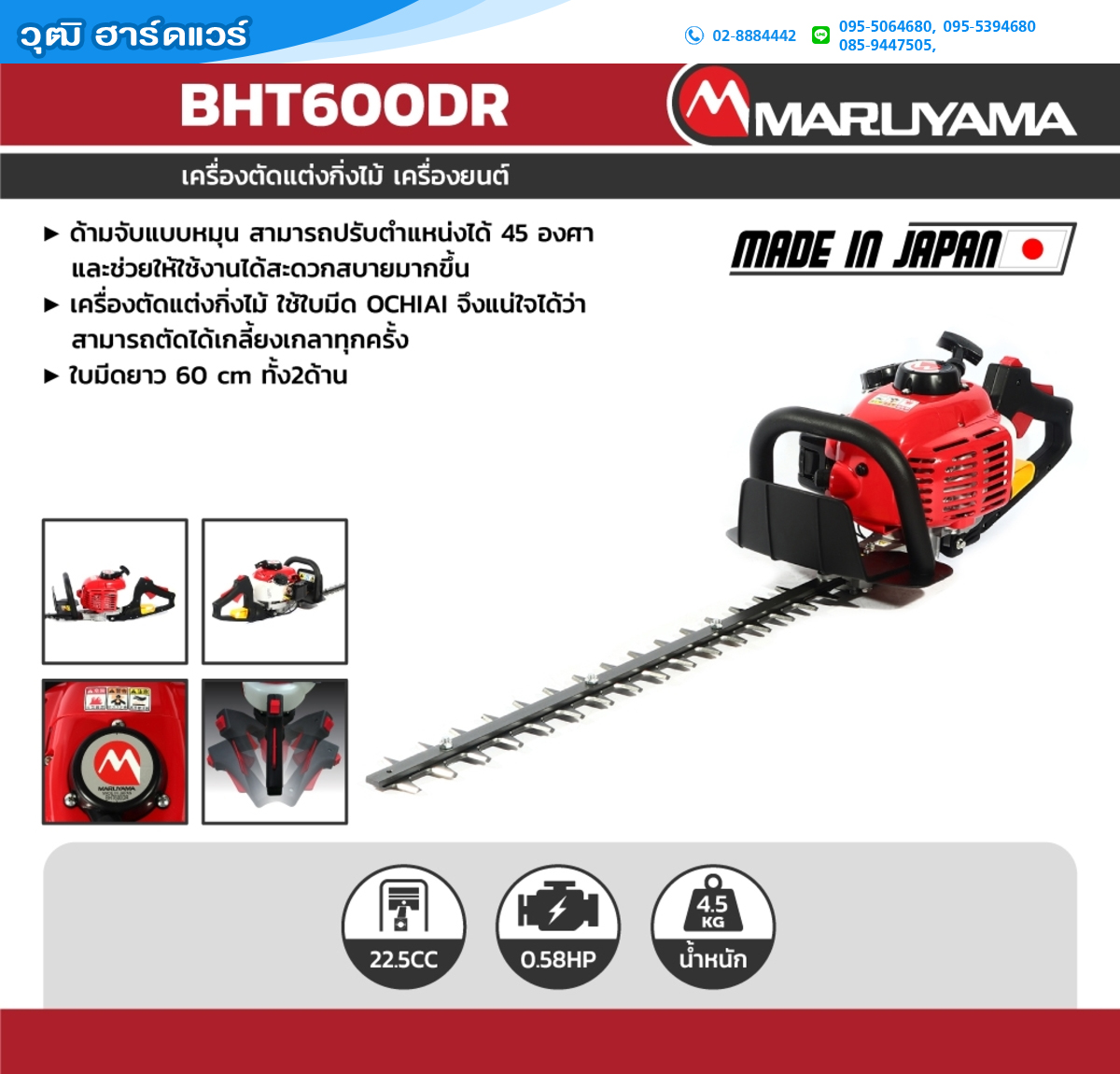 กำลังเครื่องยนต์ 0.67 กิโลวัตต์ ความยาวใบมีด 60 ซม. (มารูยาม่า)