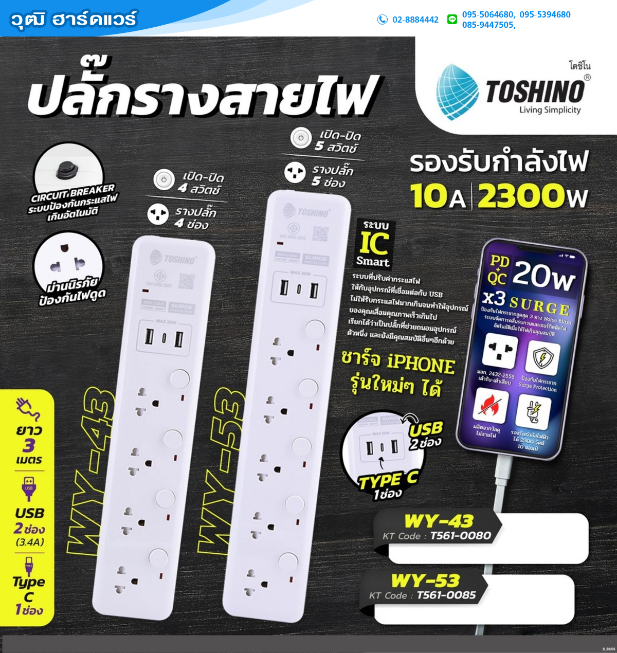 ปลั๊กไฟ 5 ช่อง + 2 USB + 1 Type C 4 สวิตช์ TOSHINO รุ่น WY Series สายยาว 3 เมตร