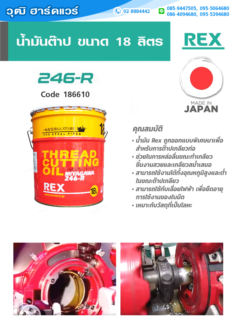 - น้ำมัน Rex ถูกออกแบบพิเศษมาเพื่อสำหรับการต๊าปเกลียวท่อ |