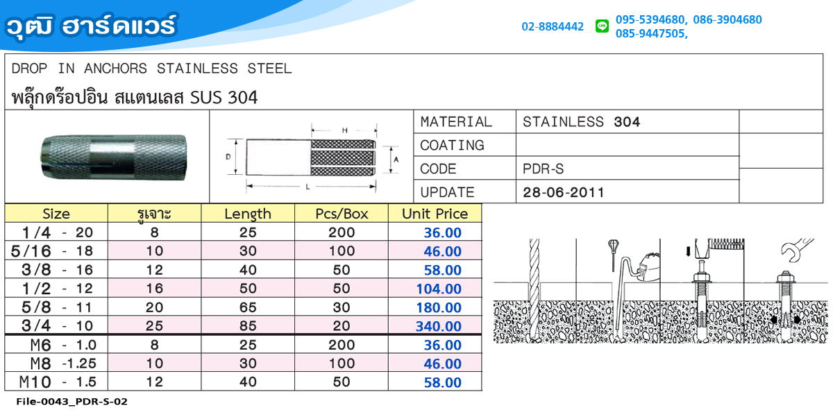 พุกดร็อปอินสแตนเลส 304 3/4"x25x85 |