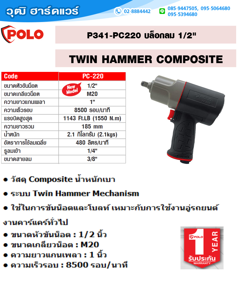 POLO บล็อกลม 1/2 นิ้ว แรงบิดสูงสุด 1,143 ฟุต-ปอนด์ (1,550 นิวตันเมตร) รุ่น PC-220 ความยาวแกนเพลา 1 นิ้ว