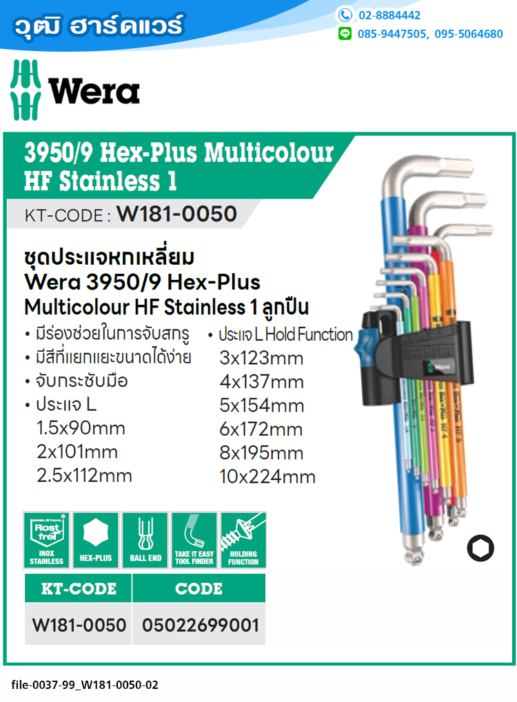 Wera 05022699001 ชุดประแจหกเหลี่ยมหลากสี 3950/9 Hex-Plus 1 ลูกปืน