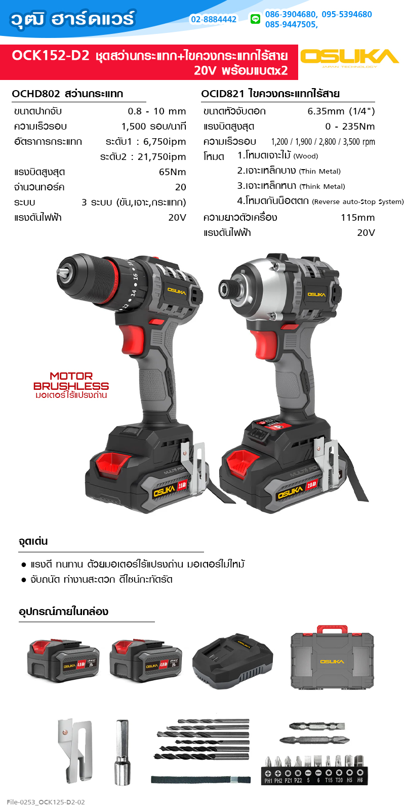 OSUKA OCK152-D2 ชุดสว่านกระแทก+ไขควงกระแทกไร้สาย 20V พร้อมแบตx2