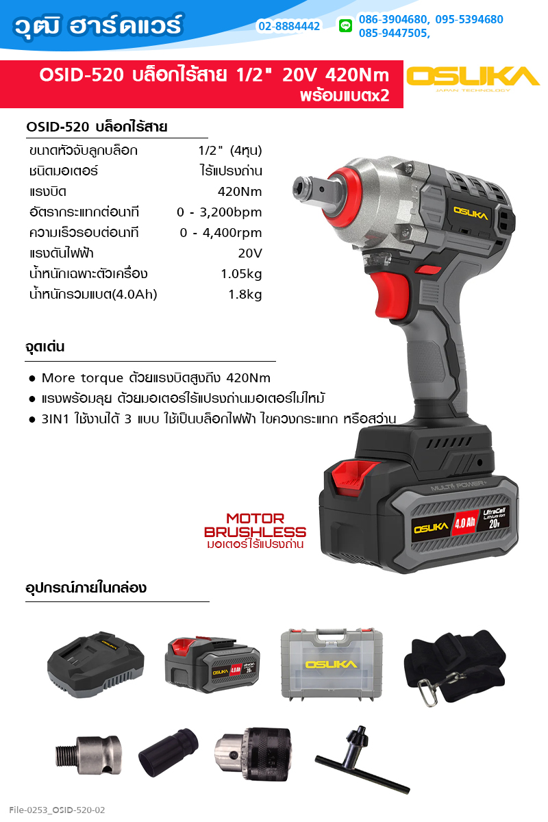 OSUKA OSID-520 บล็อกไร้สาย 1/2" 20V 420Nm พร้อมแบตx2