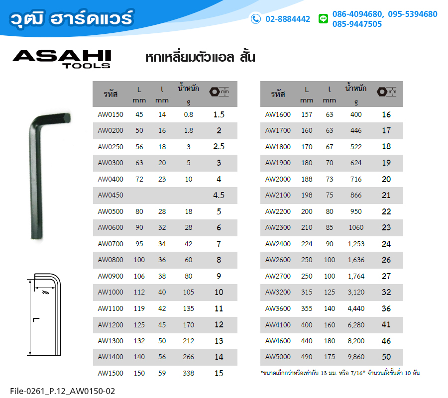 ASAHI AW1200 หกเหลี่ยมตัวแอล สั้น M12 (10อัน/แพ็ค) |