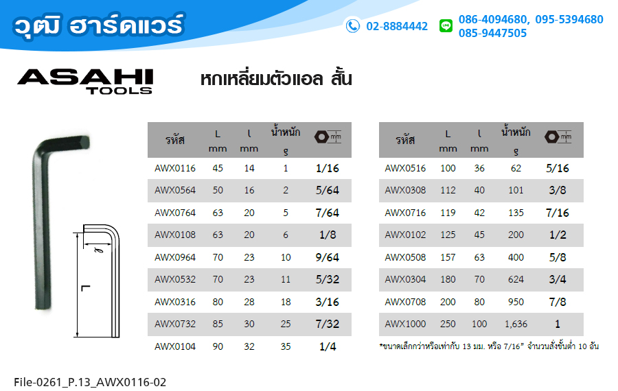 AWX0716 ASAHI AWX0716 หกเหลี่ยมตัวแอล สั้น 7/16" (10อัน/แพ็ค)