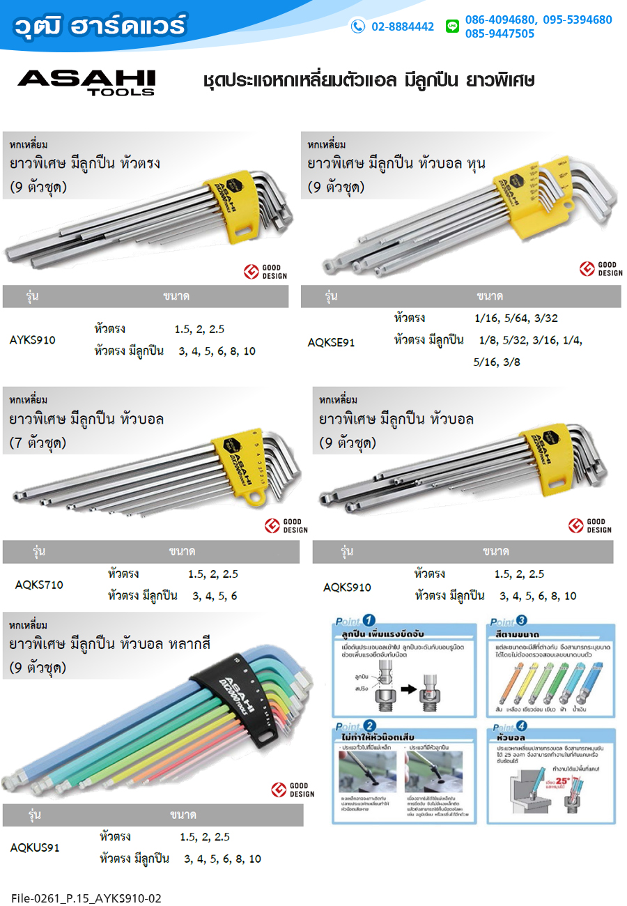 ASAHI AYKS910 ชุดประแจหกเหลี่ยมตัวแอล มีลูกปืน ยาวพิเศษ