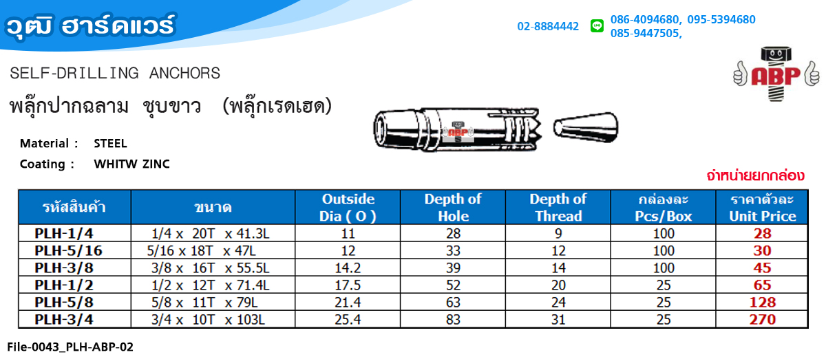 PLH-3/8 | ABP พุกปากฉลาม ชุบขาว 3/8" (100ตัว/กล่อง) |