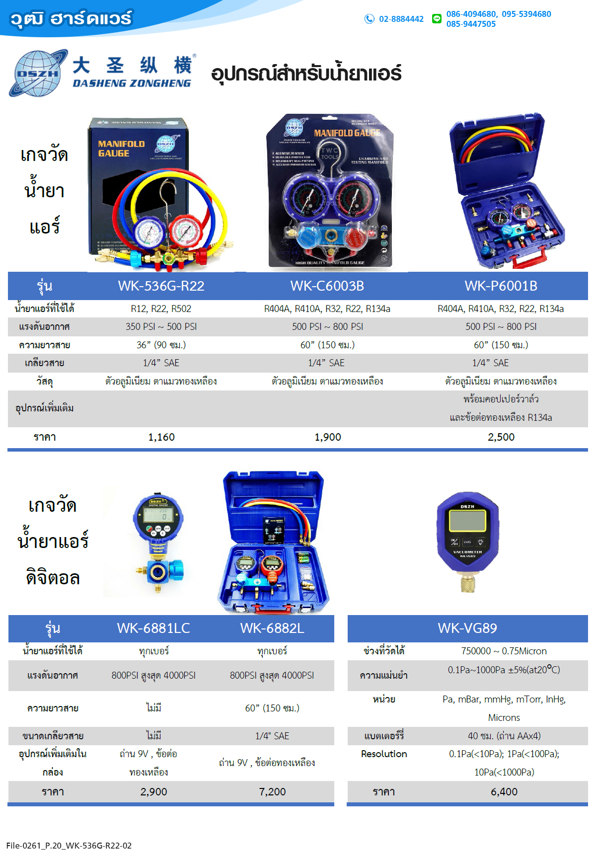 DSZH WK-P6001B เกจ์เติมน้ำยาแอร์ R404A, R410A, R32, R22, R134a สาย 60"