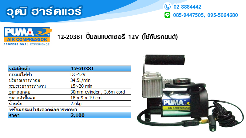 PUMA 12-2038T ปั๊มลมแบตเตอรี่ 12V (ใช้กับรถยนต์) |